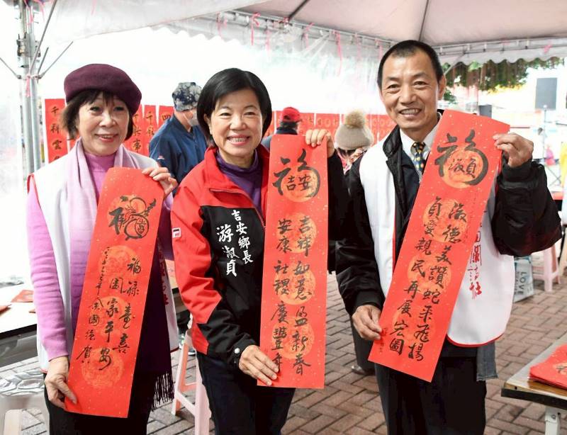 春節將屆,吉安鄉公所邀請書法名家現場書寫春聯,規劃共13場次,首場於1月28日上午9時30分至11時30分在永安社區活動中心登場,現場揮毫,為鄉親送上新春祝福。 鄉長游淑貞表示,今年攜手花蓮縣書法學會、美育交流學會、洄瀾詩社、長青書畫會、仁里老人暨關懷協會、吉安鄉農會退休人員協會、社區發展協會及福境宮等單位共同辦理,活動邀請花蓮縣書法學會理事長曾興德、洄瀾詩社理事長張玉環、長青書畫會理事長湯大凰、美育交流學會理事長彭榮美等,在現場為民眾書寫吉祥春聯。