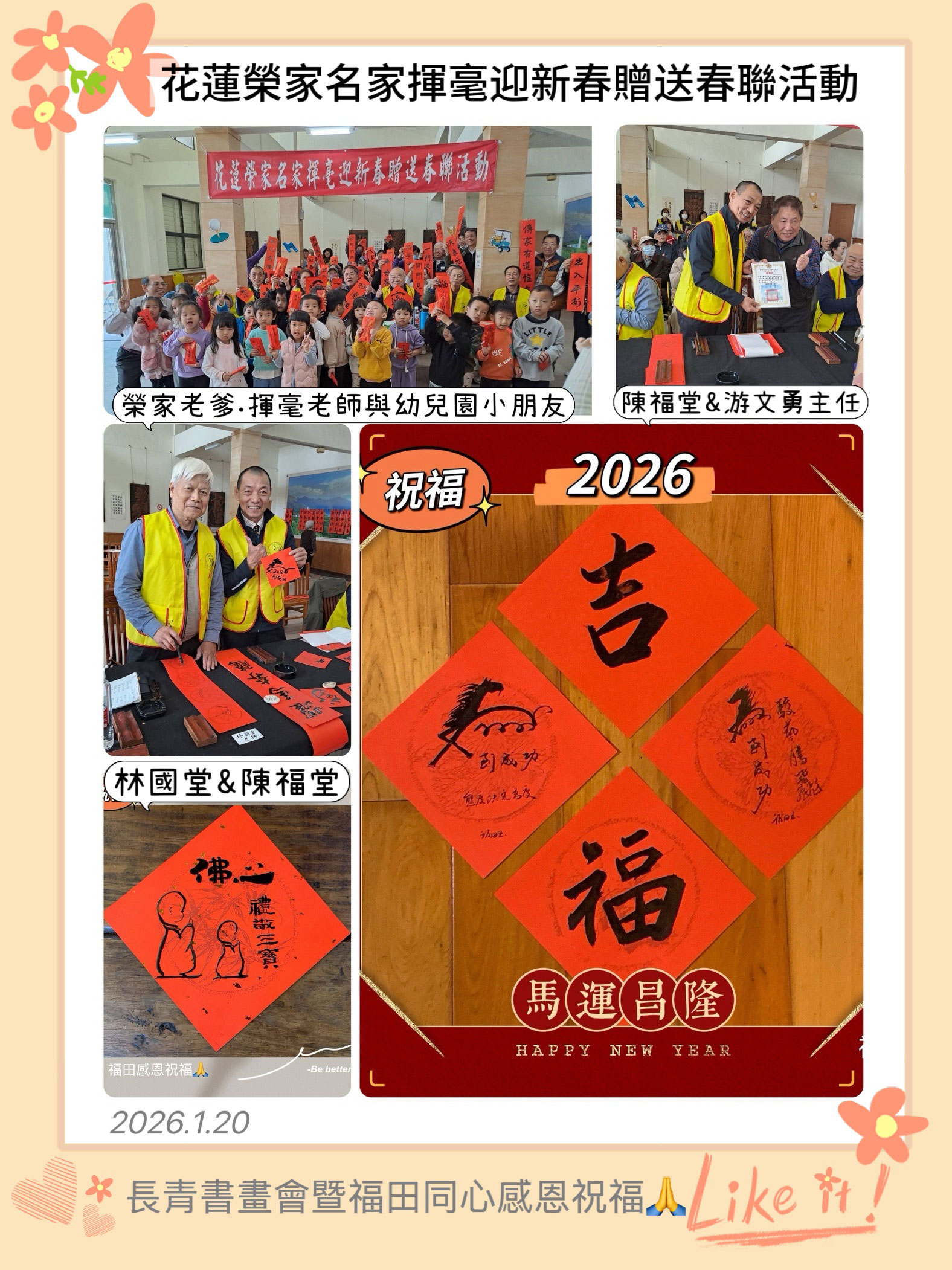 農曆春節腳步近了,花蓮榮家辦理「金馬賀歲揮毫迎新春」活動,二十日特別邀請花蓮縣長青書畫會理事長湯大凰帶領林國堂老師、古華忠老師、田玉生老師、徐慶國老師、陳福堂老師及花蓮縣書法學會吳宗慶老師蒞臨現場揮毫,以筆墨傳遞祝福,為榮家住民提前送上滿滿的新年好彩頭,現場洋溢濃厚年節氣息。